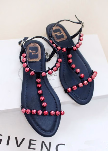 黑色是白搭的款式,这款黑色平底鞋款式搭配红色的透明珠子镶嵌。现在的平底凉鞋都是以带子为主,这样连接起来的平底凉鞋绝对很清爽,即可以展现脚的美,又可以很好的搭配连衣裙,是夏天美翻了的节奏。
