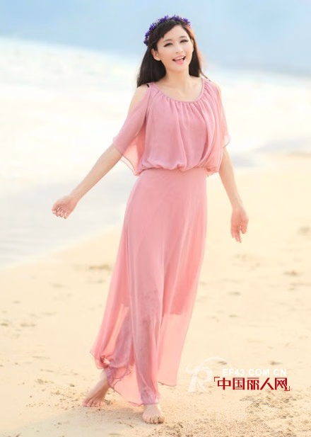 沙滩裙一般都是长裙的款式,甜美的装扮,能hold住沙滩裙的姑娘肯定具有女神气质,这款粉色连衣长裙款式搭配,露肩的设计甜美极了,雪纺的面料轻薄又舒适,长长的头发随风飘很唯美的画面。