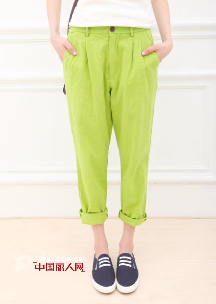 糖果色哈伦九分裤,夏天吸睛显瘦穿搭,从此再也不用担心穿什么会显瘦了,荧光绿你hold住吗?这款荧光绿哈伦九分裤款式搭配一双懒人鞋,配上一件白色雪纺上衣,有种慵懒的感觉,特别的轻松自然。