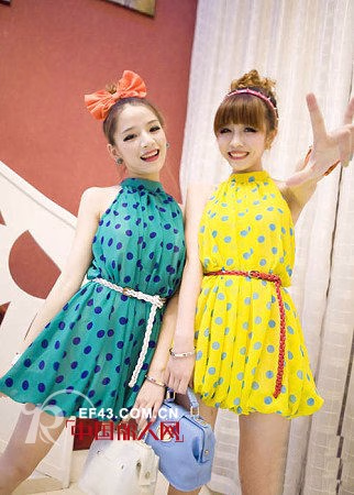 可爱波点挂脖式连衣裙款式,不同颜色的搭配也绝对可爱,活力波点款式孔雀绿和亮黄色两种颜色连衣裙款式,腰带的搭配更显身材,呆萌齐刘海,可爱俏皮丸子头,这样的装扮出街绝对吸睛。