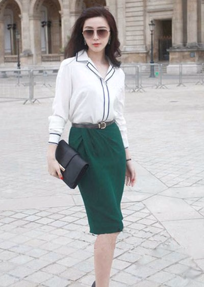 美艳的范冰冰也是绿裙的忠实追随者,她不止一次在红毯上选择绿色礼服,在私底下,亦无法抗拒绿裙的魅力,白色衬衣搭配绿色包臀裙,让我们看到了一个不一样的知性冰冰。