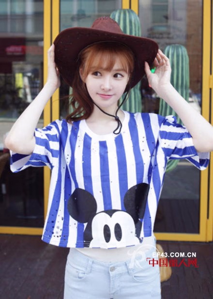 蓝白拼接短袖T恤款式宽松的版型,点缀着米老鼠图案很可爱哦,下身搭配一条浅色牛仔短裤搭配,简单而又时尚,个性的宽松装扮露脐不仅是性感还是身材的展现,夏季这样的可爱装扮轻松简单又吸睛。