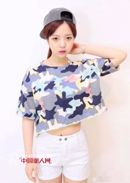 露脐装款式搭配,这款宽松的T恤不管是微胖姑娘还是较小姑娘都绝对能驾驭,迷彩色的图案设计帅气又拉风,配上一条白色短裤,绝对清新感,配上一顶鸭舌帽个性女装扮绝对吸睛。