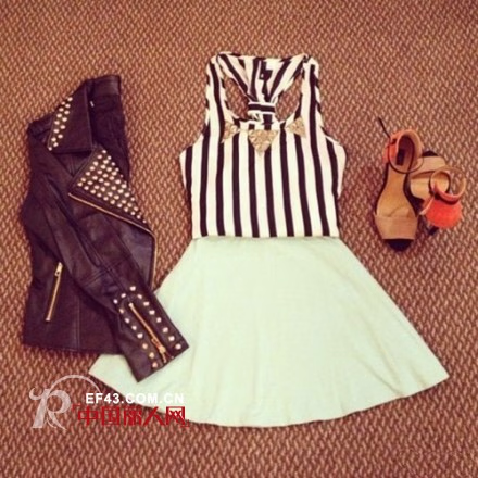 这款黑色皮衣款式内搭意见浅色伞裙上衣搭配条纹背心,个性的背心款式配搭伞裙,个性的单穿款式配上一款黑色皮衣这样的帅气绝对前所未有,配上高跟鞋机车风格也可以很小女人。