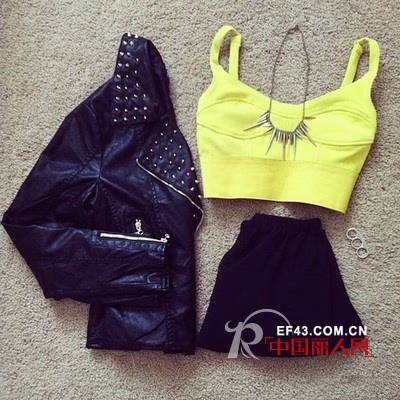 机车美眉是你喜欢的装扮吗?这款荧光绿的短款背带款式搭配一条黑色短裙,这样的露腰设计绝对的个性,这种天气配上一件黑色机车服,绝对个性,美女配名车,不要四轮,摩托车是最拉风的出街工具。