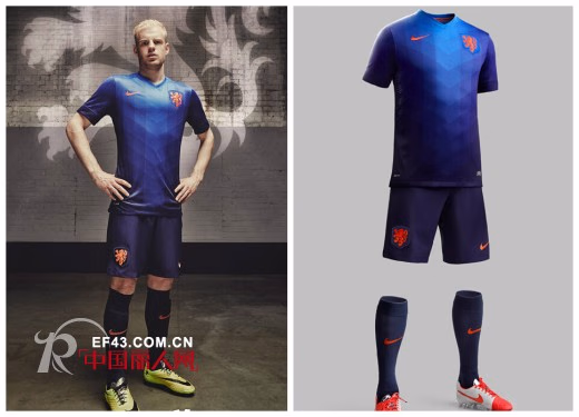 2014世界杯荷兰队球衣由耐克公司设计,新球衣的设计结合了荷兰文化,同时能提供更好的创新性能表现。新的客场球衣为等距离的V型网格设计,颜色自上而下由明蓝变为深蓝,最终以紫色结束。在形状上,炽热与深沉并举,代表着荷兰的地貌与水在荷兰人生活中的重要地位。蓝色代表荷兰皇室,同时蓝色也是荷兰国旗的颜色之一。设计也反映了荷兰足球的精髓与范加尔团队的动感灵巧的风格——每位球员用他们全心全意的传切与跑动投入球队,构成一座错综复杂的系统。