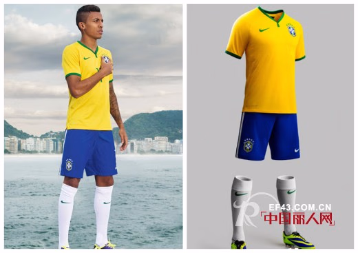 2014世界杯东道主巴西球衣由耐克公司设计。耐克的设计团队在设计2014款国家队球衣时, 努力融入巴西独特的文化气质,延续其极具文化传统的黄色队服。巴西球衣采用了全新的Y 型领设计,看起来轻松、舒适。在对巴西国家队每一名球员进行身体扫描后,耐克的设计师利用扫描数据,以及球员的建议,推出了这种独特的领口设计,极具舒适性。巴西队服上的徽章图饰也做了更新,在图饰上加上了金黄色的金属感波纹,以带来闪光效果,而且2014队服的徽章图饰也略大一些。