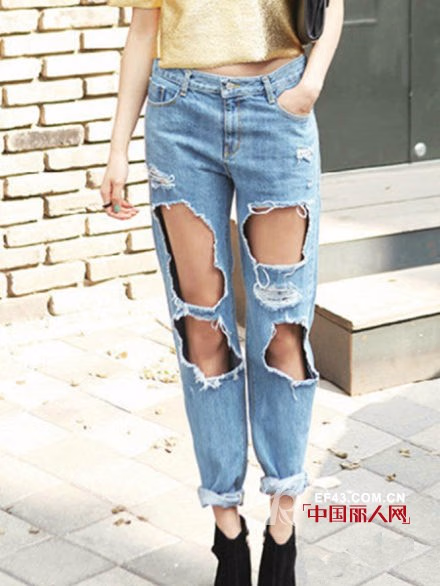 哎哟喂,亲你能在破一点吗?你这么“穷”你妈知道吗?如果对于我们妈妈级别说来,这样的破裤子买来干嘛,好好的裤子把它剪成这样子,妈咪们这可是今年流行哦,你们都out了,这样的大破洞你们hold住吗?小脚的版型,硕大的破洞设计将膝盖和大腿完美的呈现,绝对吸睛。