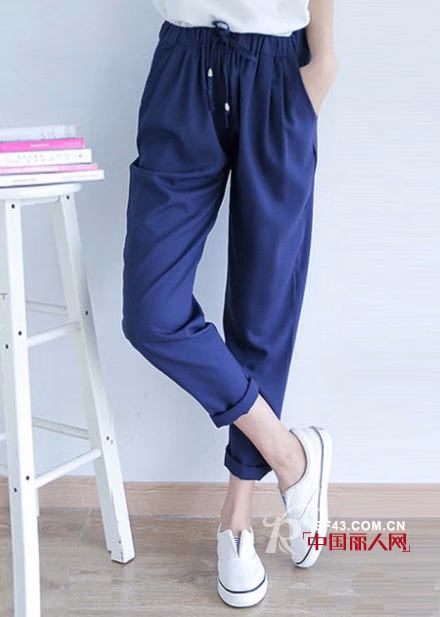 很多人穿哈伦裤不知道穿什么鞋子好,最好的搭配就是平底鞋,哈伦裤+平底鞋才是时尚新宠儿,本季流行的哈伦裤搭配平底鞋绝对潮,这款宝蓝色的哈伦裤适合微胖的女生穿,配上一双白色平底鞋,绝对亮眼。