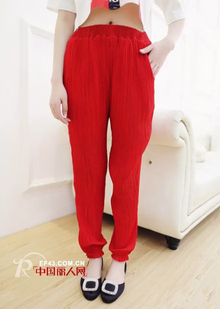大红色哈伦裤,要不要这么潮呢?大红色的哈伦裤怎么能hold住呢?这款红色哈伦裤是松紧的设计,下面还是松紧的裤口设计个性十足,配上一件白色T恤绝对亮眼,鞋子则是搭配一双黑色平底鞋,这样的经典颜色搭配绝对赞。