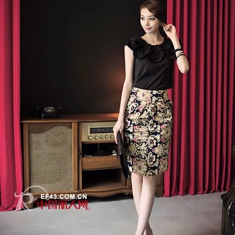 金色的刺绣印花裙高腰的版型,很好的拉长了腿部的曲线,高档的钩花精致雅观。点点红色的点缀,为整体增添了几分甜美。这样的一步裙搭配一件黑色的雪纺衫,轻盈的质地,性感魅惑的色彩,搭配一双高跟鞋,高雅气质。