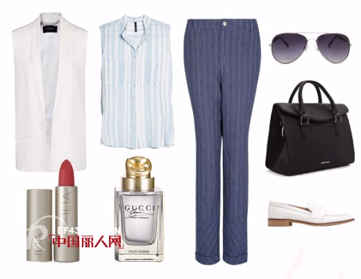 这件按照西装设计的长款马甲有点偏中性风,颜色本白,款式修长、十分贴身。左右对称的口袋打破了衣服长度带来的尴尬。与之相配的内搭衬衫则属于双色拼接的格纹系列,无袖清凉,风格上略显清新。至于蓝色高腰长腿裤,更是秀出小蛮腰和显瘦的绝佳神器,只要将衬衫底部扎进裤腰内,就能凸出你的傲娇身材。当然,出街时还少不了时尚潮范的太阳眼镜,既能遮挡刺眼的紫外线,又显得酷劲十足。而黑色手提包也是都市白领的必备单品,黑色更能衬托出你的霸气和干练。还有皮质乐福鞋,谁说只能给男士穿呢?女性也能穿出个性和品味。最后,再加上一抹靓丽的红唇和喷上馥郁的香水吧,于职场中性风中加点女人味,点亮你的整个装扮。