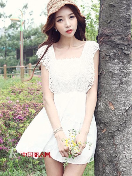 钩花蕾丝连衣裙,清新淡雅,精致的蕾丝钩花,高腰的设计很显腿长,背心的款式,让女生看起来小巧玲珑,优雅动人。再搭配一顶编制遮阳帽,很是凸显清新脱俗的小女生气质。
