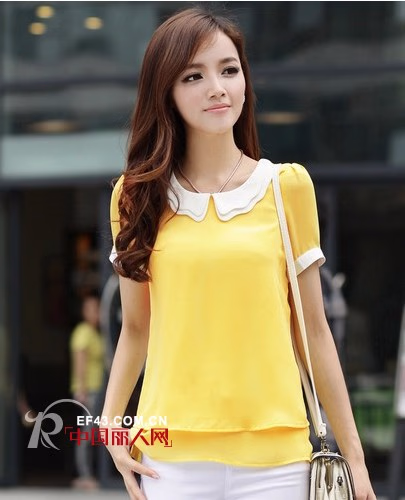 都到了夏天,就不要再穿那么灰暗了吧,还是鲜艳的颜色,这次是明黄色,很精神很靓丽的色彩哦,而且能把你的肤色衬托得更为白皙。虽然没了露肩之类的设计,但加入撞色娃娃领与白色包边袖口,一下子就将色彩氛围变得更加明亮,年轻的感觉,活力无限。