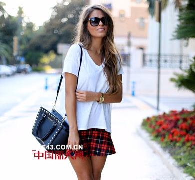 搭配单品:白色长款T+红色格纹伞裙+黑色单肩包+渐变墨镜