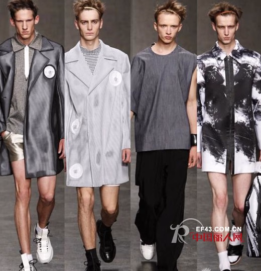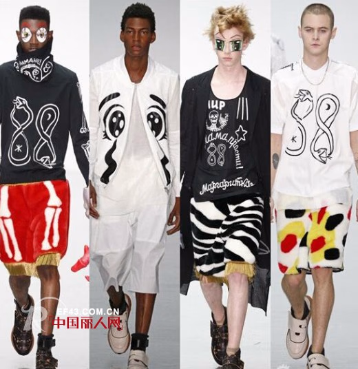 还记得今年上海时装周上,上官喆关于甜美少女梦和街头潮流风的叛逆组合吗!本季伦敦时装周上呈现的15春夏男装继续着自己搞怪的风格。以白色长风衣和短夹克搭配中长短裤为主调,柔软薄透的材质、自然而然的褶皱,结合着黑色中国文字的涂鸦艺术,将内心世界的悸动完全寄托在了流动的身形中。穿插其中的几件邪恶手模道具让人想起了近来热映的电影《哥斯拉》情节,谁知道是不是儿时的动慢梦给了他今天的创意灵感呢!