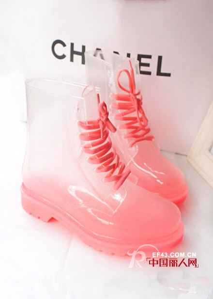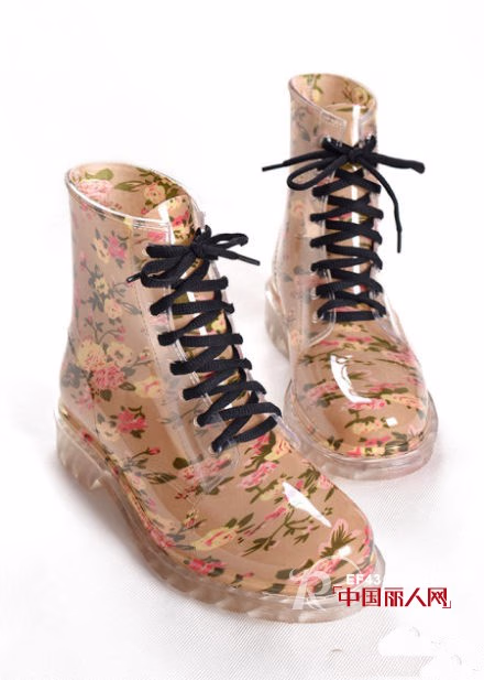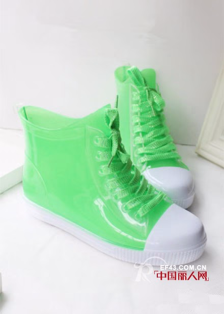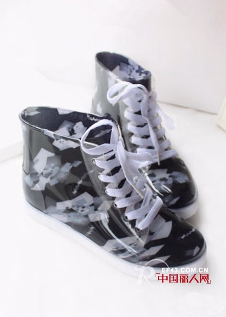 现在雨鞋可以是透明的,可以是绑带的,可以是印花,也可以是糖果色,可以是甜美的渐变色,雨鞋也可以穿出很多花样,雨鞋可以在下雨天行走不湿脚,更可以是下雨天的靓丽风景线。