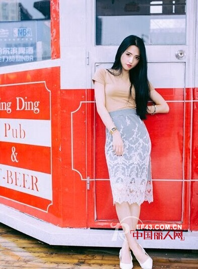 米黄色的T恤,纯色系的T恤不需要添加任何点缀也能突显气质,搭配白色蕾丝的高腰包臀裙,再加上一双白色尖头高跟鞋,非常柔美有女人味。