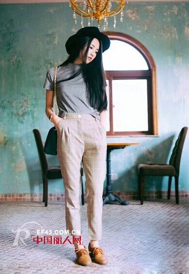 纯灰色的高领T恤也是百搭气质款,搭配米色格子九分裤,加上黄色复古皮鞋,非常英伦范儿,黑色帽子和链条包搭配也很时髦。