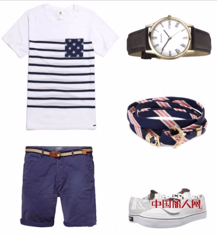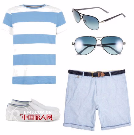 条纹海军风T恤搭配,蓝白相间的T恤款式是型男的必备装,蓝与白的拼接是清新的装扮,夏天墨镜是必备的吸睛耍帅配搭,配上一条浅蓝色短裤,整体超具清新的装扮怎能不吸睛呢?