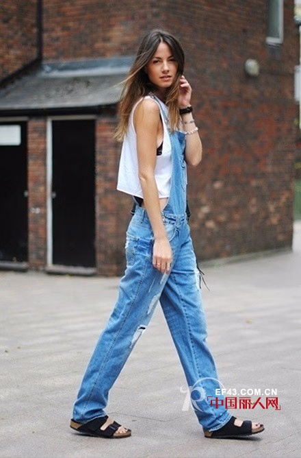 夏天牛仔裤都是浅色系,浅色的背带牛仔长裤,搭配一件白色背心,短款背心可以露出肚脐,性感无疑。穿背带裤也可以穿出性感的感觉,背带裤不仅仅是只有一种俏皮的感觉,性感同在,破洞牛仔裤配上一双男友风格的拖鞋很个性哦。