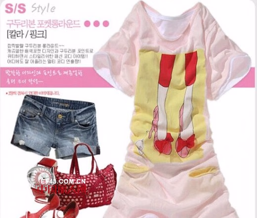 高跟鞋卡通图案短袖长T恤打造青春shopping女孩造型