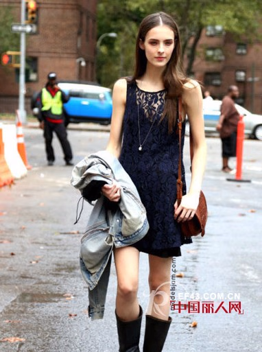 充满模特范的潮人身着深蓝色蕾丝连衣裙两件搭,内搭的背心连衣裙深V设计让酥胸若隐若现,还有什么比若隐若现能更吊人的胃口,搭配黑色皮质长靴增添帅气庞克味道,学院风单肩包不忘展示她的青春活力。