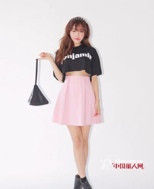 印有英文字母的黑色短T,搭配高腰粉色伞裙,小女生的气质彰显无疑,是扮萌减龄的利器哦~