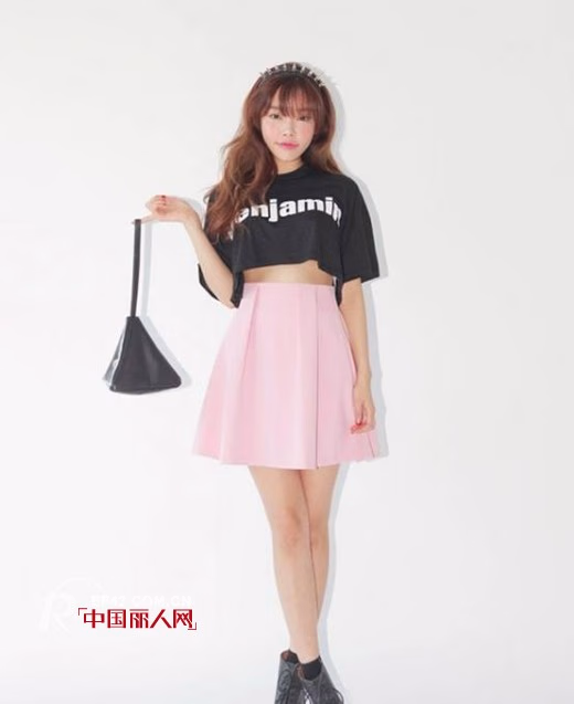 印有英文字母的黑色短T,搭配高腰粉色伞裙,小女生的气质彰显无疑,是扮萌减龄的利器哦~