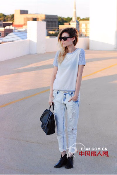 一件简单的白色T恤,搭配紧身的破洞牛仔裤,完美好身材立刻秀出来!可以搭配休闲的帆布鞋,或是高跟凉鞋更添时尚感,出街时复古包包也不可或缺哦!