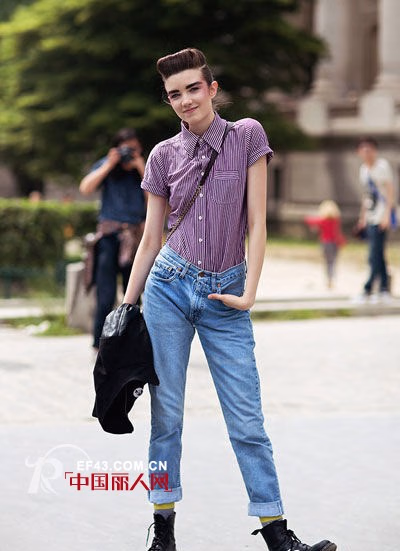 今年Boyfriend风格也十分的流行。一条简单的水洗卷边牛仔裤,搭配一件紫色竖形条纹衬衫十分俏皮,鞋子可以搭配马丁靴其实也是很显身高,露出最为纤细的脚踝,让腿部看起来更加修长了。