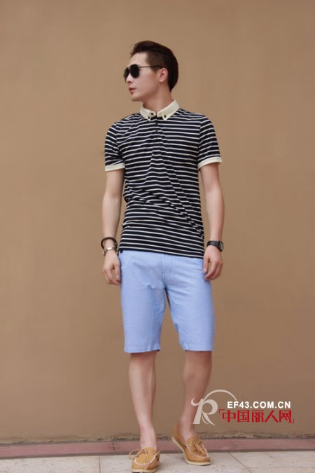 黑白条的T恤衫,是海滩度假的经典元素,搭配一条明丽色彩的蓝色短裤,有种清爽、青春的感觉。搭配卡其色的休闲鞋,佩戴黑色墨镜,亦令这身装扮更添几分柔美与时髦。