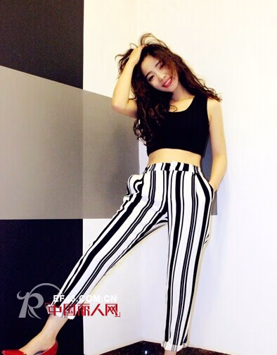 黑色露脐小背心搭配黑白条纹休闲裤,颜色搭配很经典,款式也时髦俏皮,红色鞋子搭配点亮色彩,非常有风情。