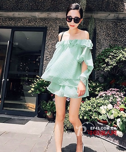 套装推荐:一字肩粉绿色雪纺波点套装