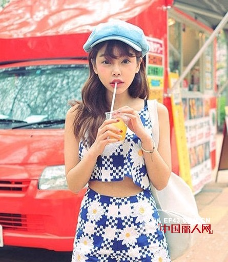 套装推荐:蓝色印花吊带上衣+热裤套装