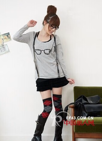 带有格纹的过膝中筒袜表现出学院派风格,加上黑色长靴、眼镜、背带裙的修饰,呈现出浓浓的少女气息。