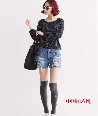 一件黑色上衣,白色圆点的点缀使沉闷的黑色生动起来,搭配一条破洞牛仔短裤,一双灰色紧身长筒袜使下半身不再单调,整装协调起来了,红色的染发潮味十足。