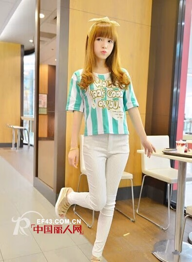 绿色条纹字母短T恤清新活泼又减龄,搭配白色细条纹高腰紧身裤,非常清爽哦,脚上穿上金色厚底凉鞋,时髦又吸睛,还能显高变苗条哦。