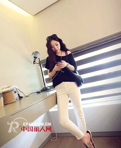 黑色露肩短T恤不但显瘦,露出肩膀还显得很性感,搭配白色高腰紧身裤,非常清爽时髦哦,加上金色拖鞋和黑色单肩包,时髦又显气质。