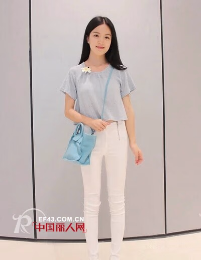 灰色露脐短T恤,纯色素雅清新,用一颗胸针点缀更可爱,搭配白色高腰紧身裤不但让身材更加苗条,还非常显高打造好的身材比例,蓝色单肩包和单鞋都非常清爽好看。