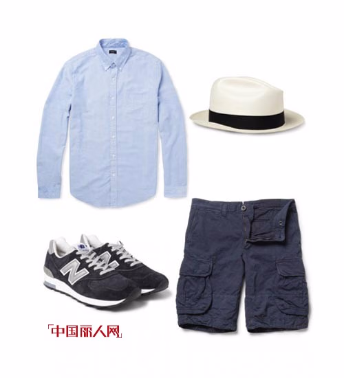 我们需要的装备是:浅蓝色长袖衬衫,深蓝色休闲短裤,白色巴拿马帽,深蓝色球鞋。