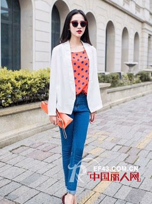 夏季最常见的搭配莫过于此了。浅蓝色的牛仔裤勾勒了迷人的腿部曲线。搭配的红色波点衫十分的减龄。将青春气息的学院风格演绎的淋漓尽致。白色的长袖防晒服能够够很好的减少紫外线对皮肤的伤害。