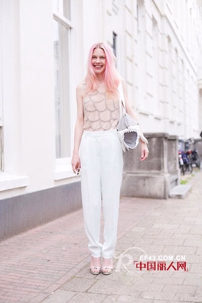 浅粉发色和裸粉背心与白色西裤打造温柔形象。