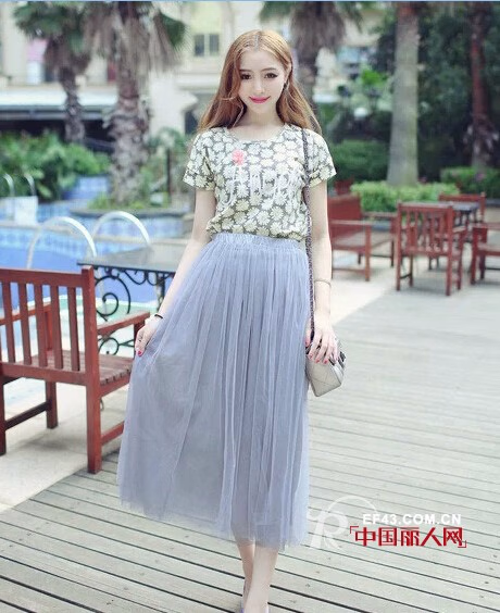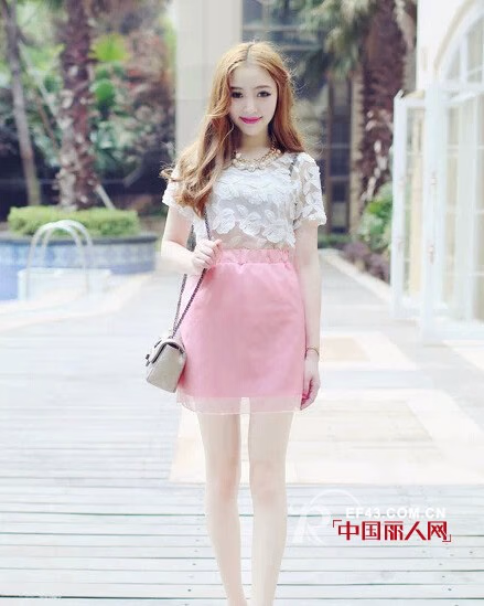 夏天的颜色,白色透视花朵网纱上衣搭配粉色欧根纱短裙,很喜欢的呢