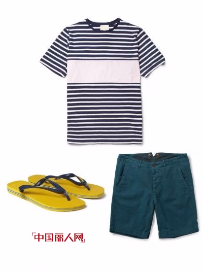 虽然在沙滩上只是穿着拖鞋在沙滩漫步而已,不过整体造型可不能因为太过休闲而被忽视掉。虽然只是简单的复古条纹T恤,深蓝色竖条纹短裤,黑色帆布拖鞋,在海滩穿搭中可以运用纯色调单品配以海军元素,清爽悠闲。