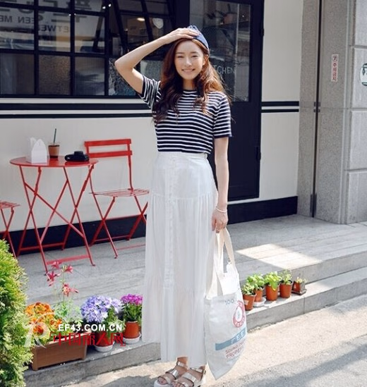 黑白条纹T恤,搭配白色的高腰雪纺长裙,带有浓浓的女人味。