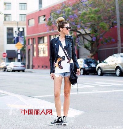 示范搭配:白底印花T恤+黑色皮质机车夹克+磨边牛仔热裤+黑色高帮帆布鞋+黑色斜挎包,从上面几个look看来,热裤+帆布鞋真是显高秀长腿利器!