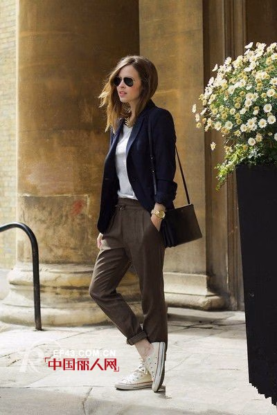 示范搭配:深蓝色休闲西装外套+棕色卷边修身九分裤+米黄色帆布鞋+黑色单肩包,米黄色的帆布鞋中和了衣服和裤子的沉重感,显得轻快活泼。