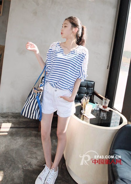 宽松T恤+短裤显瘦潮搭示范LOOK,因为宽松T恤没有那么多束缚蓝白条纹的海军衫款式,配合横条纹的手提包,便有更好的显瘦功能,肩部小花点缀更显可爱。蝙蝠袖宽松自在,手臂肉肉多一点也不用怕。配搭白色短裤,淡雅清新。