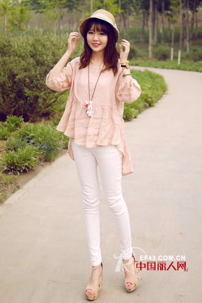 粉色中袖让你变身清甜妹子中袖挡住肉肉臂不规则裙摆显独特更能显美少女气质,下面配上一款修饰腿型的小脚裤比平时小一号更紧致,鞋子配上一双坡跟鞋粉色鞋面显少女甜美坡跟印花独特新颖更添加可爱迷人。